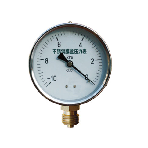 不锈钢膜盒压力表根据普通膜盒压力表的结构原理而研制的具有耐腐蚀的微压测量仪表。导压系统及外壳均采用不锈钢材料制成。应用于耐腐蚀要求较高的工艺流程中对各种气体介质的微压和负压的测量;也可用于锅炉通风、气体管道、燃烧装置等及其它类似设备上。是引进国外先进技术设备中同类仪表实现国产化的理想配套产品。