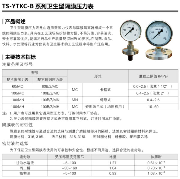 卫生型隔膜压力表是由通用型压力仪表与隔膜隔离器组成一个系统的隔膜压力表。具有在工艺现场装拆快捷方便、不易污染、容易清洗、安全可靠等优点。能满足药品生产质量规(GMP)的要求。在制药、食品饮料、水处理等行业对仪表有卫生要求的工艺流程中得到广泛应用。