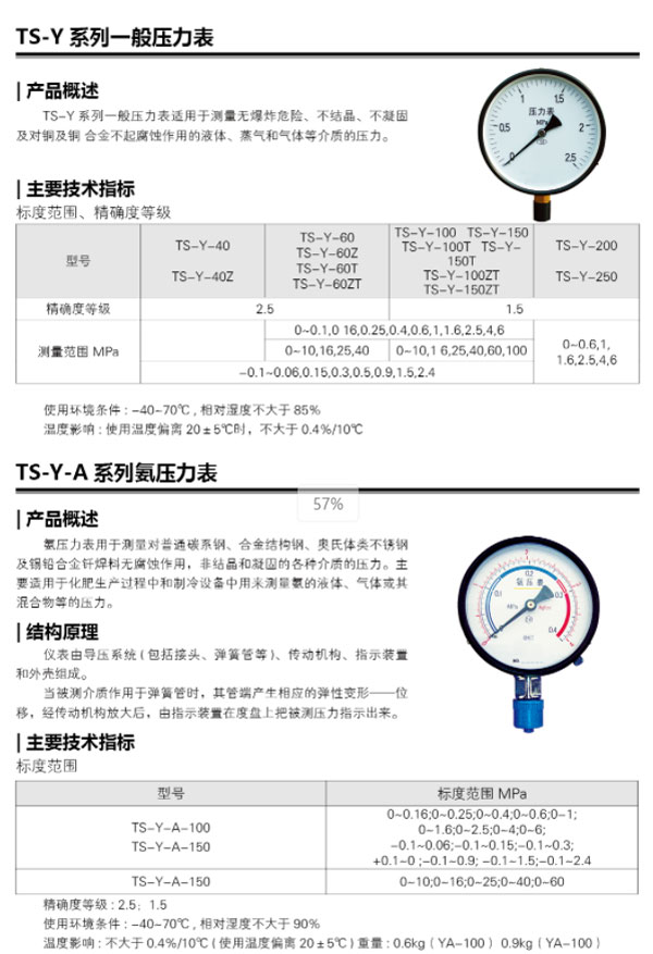 TS-Y 系列一般压力表适用于测量无爆炸危险、不结晶、不凝固及对铜及铜 合金不起腐蚀作用的液体、蒸气和气体等介质的压力。