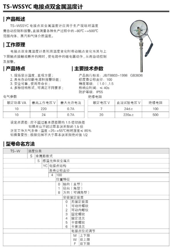 TS-WSSYC 电接点双金属温度计应用于生产现场对温度需自动控制和报警。直接测量各种生产过程中的-80℃~+500℃℃范围内体、蒸汽和气体介质温度。